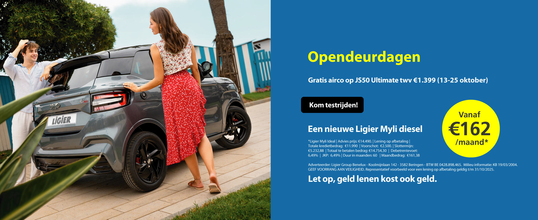 *Ligier Myli Ideal | Advies prijs: €14.490. | Lening op afbetaling | Totale kredietbedrag: €11.990 | Voorschot: €2.500. | Slottermijn: €5.232,88 | Totaal te betalen bedrag: €14.754,30 | Debetrentevoet: 6,49% | JKP: 6,49% | Duur in maanden: 59 | Maandbedrag: €161,38 Let op, geld lenen kost ook geld. Adverteerder: Ligier Group Benelux – Koolmijnlaan 142 – 3582 Beringen – BTW BE 0428.898.465. Milieu informatie: KB 19/03/2004. GEEF VOORRANG AAN VEILIGHEID. Let op, geld lenen kost ook geld. Representatief voorbeeld voor een lening op afbetaling geldig t/m 31/10/2025.